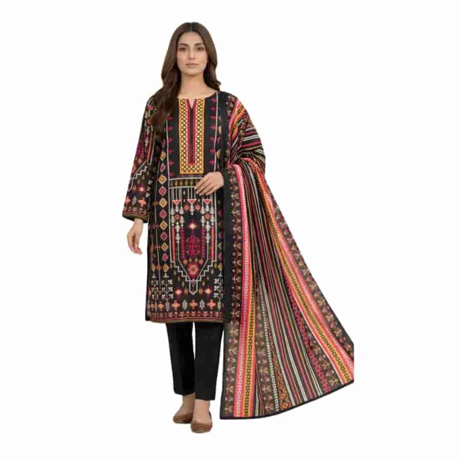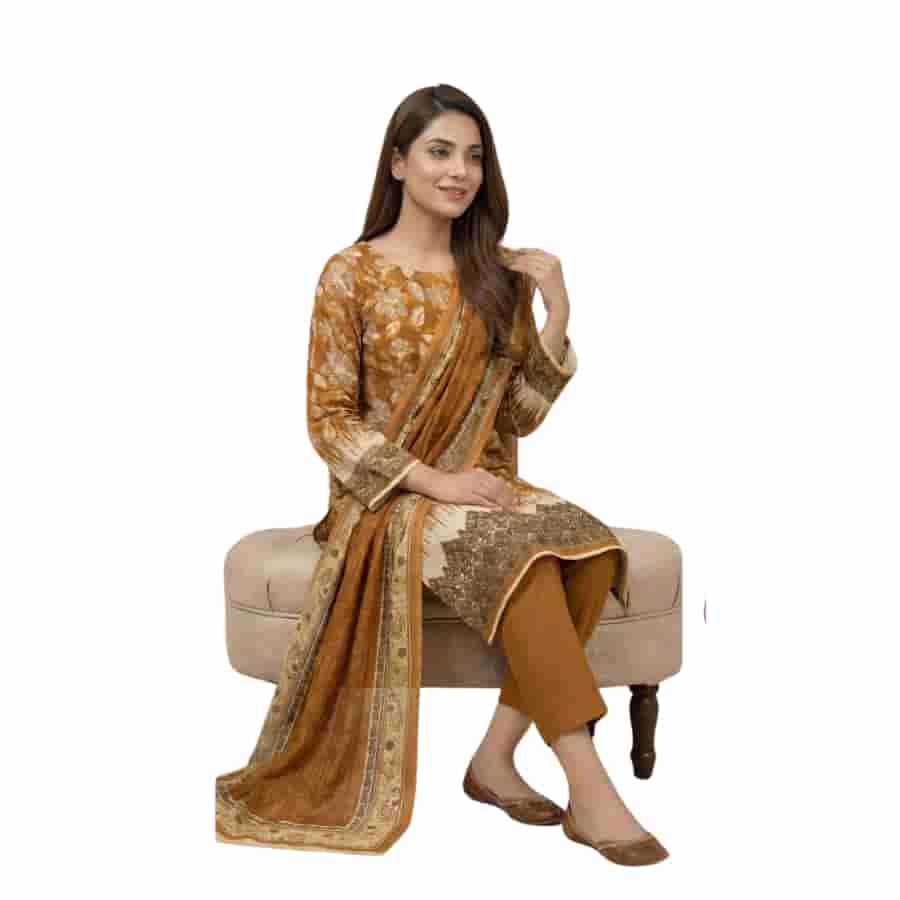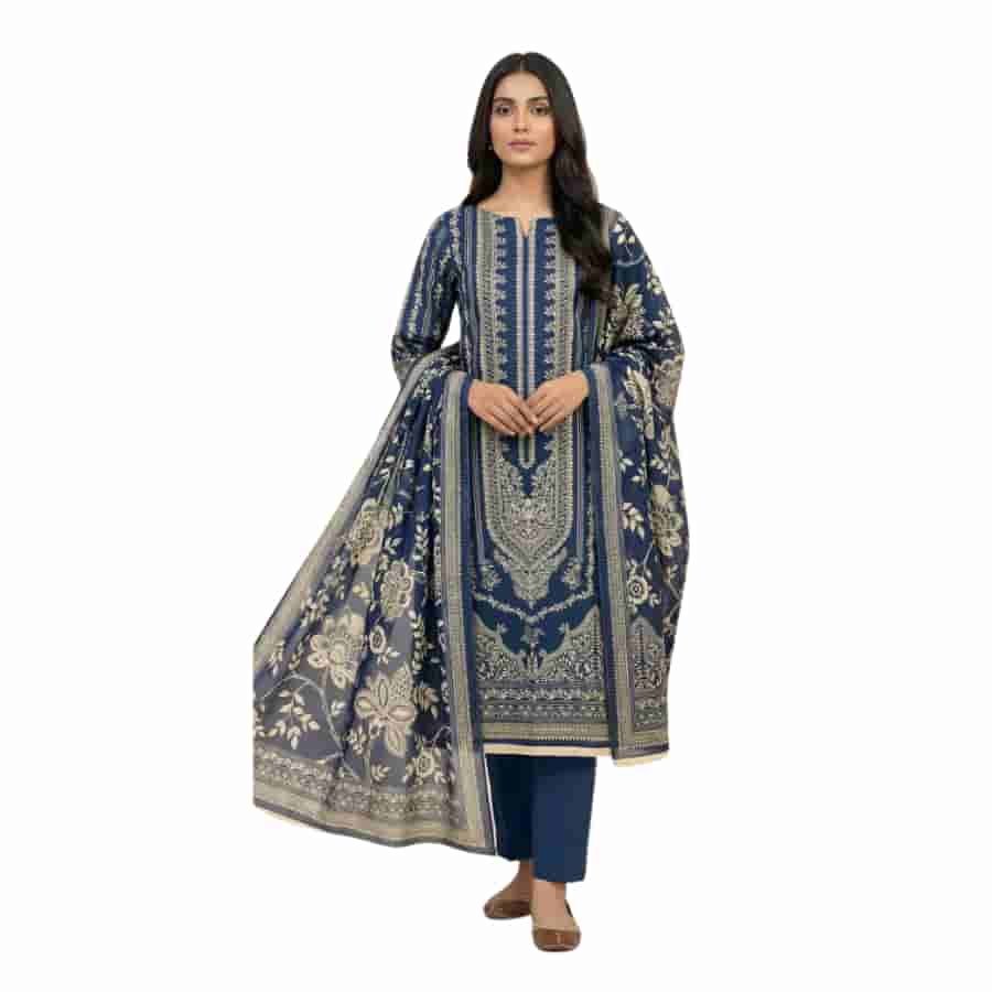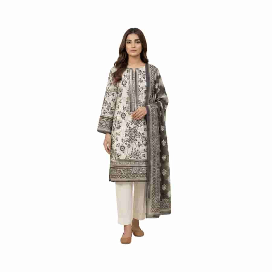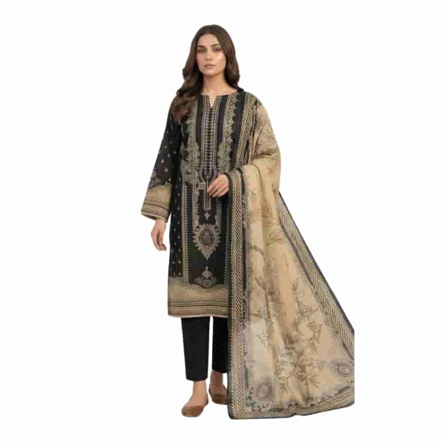 Premium three‑piece unstitched printed lawn suit from Marooj’s Gold line, Volume 30. The set pairs a richly printed shirt with an elegant printed dupatta and solid trouser, creating a striking black‑and‑gold look that works for daytime events or smart casual wear. Fabric components include a printed lawn shirt, printed lawn dupatta, and cambric dyed trouser, giving you breathable comfort, graceful drape, and a neat finished look once stitched. Clear component list from the retailer confirms the exact mix of fabrics in this line.