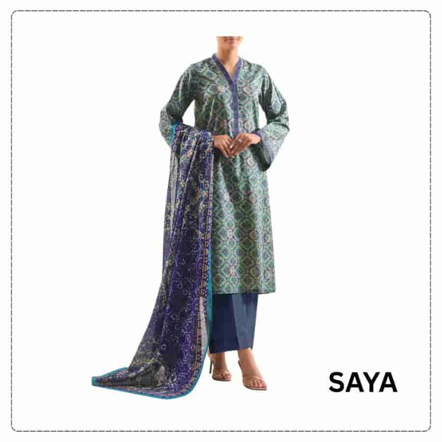 SAYA's Unstitched Printed Lawn Three-Piece Collection features a captivating all-over design printed on breathable premium lawn fabric. This elegant ensemble includes a printed lawn shirt, a printed lawn dupatta, and a dyed cambric trouser, allowing complete freedom for custom tailoring and personalized styling.